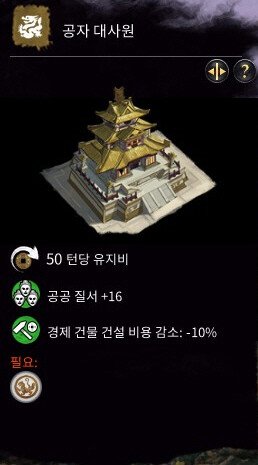 어차피 공공질서는 감당 가능한건 똑같은데. 굳이 아무런 효과가 없는 공자사원을 지을 바엔 모든 수익 +30붙은 공립 태학이 좋은건 당연.