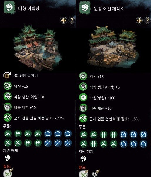 항구도시가 있을경우엔 왠만하면 상/산업으로 키우시면 되구요. 만약에 같은군에 농지나 축산, 벼농장이 있을 경우엔 항구를 식량 수급하는 어획항 쪽으로 지어주시고. 식량150% 농업수익50% 올려주는 정부지원 건물 짓고 식량에 올인하는 식량생산 기지로 만드셔도 됩니다. 그리고 건물 어떻게 짓냐고 물어보셧는데. 상/산업 도시라면 공손찬 원소일 경우엔 항구 - 화폐 주조소 - 여관 - 칠기거장 - 관청 - 시장 로 지어주시고. 나머지 팩션일때는. 시장을 공공질서 올려주는 건물로 바꿔 주세요. 마등일 경우엔 군사보급선, 공융이때는 교육기관, 나머지는 공자사원. 아니면 상국, 후계자, 지도자 성향+스킬+아이템을 모두 공공질서 올려주는 친구들로 몰빵하면 공공질서 16 충분히 커버는 가능합니다. 이럴경우엔 공손찬 원소처럼 똑같이 항구 - 화폐 주조소 - 여관 - 칠기거장 - 관청 - 시장 로 지어줘서 효율을 극대화 시켜주세요. 삼탈워 고수라면 이런 운영을 더 추천합니다.