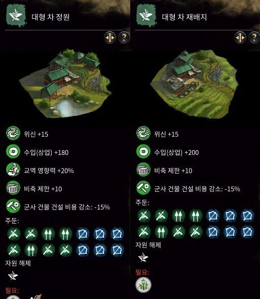 그리고 이 상업관련 소규모 정착지 중에선 당연코. '차'가 원탑이라고 할 수 있다. 일단 수익률 자체도 다른 상업 특산품에