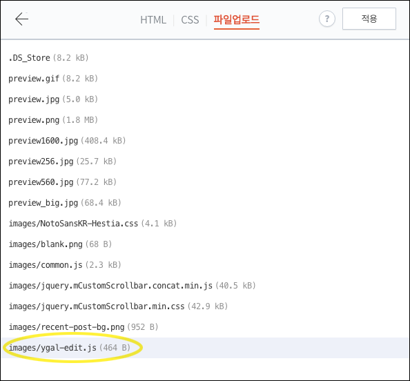 3. 파일 업로드 텝으로 이동하시고 다운받은 ygal-edit.js 파일을 업로드 해주세요.