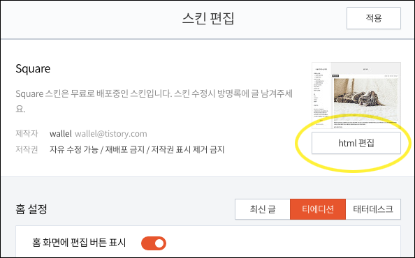 2. 운영하시는 블로그에 접속하셔서 [ 관리자 > (꾸미기)스킨 편집 > html 편집 ] 페이지로 접속해주세요.