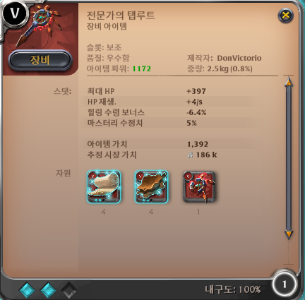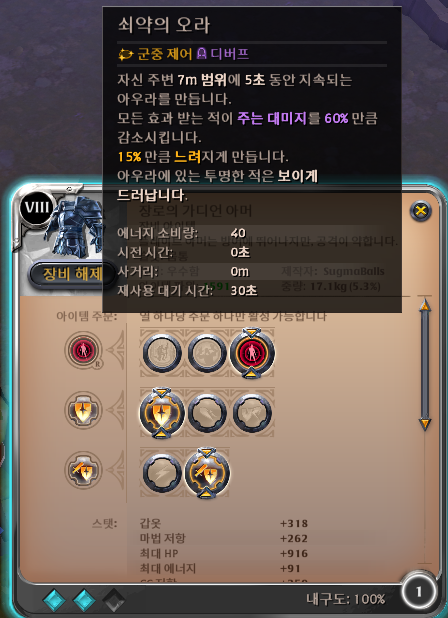 갑옷은 플레이트 아무 갑옷이나 입자 가장 무난한 게 가디언 아머... 저렴해서 좋다. 조롱으로 어그로에서 풀리거나 멀리 있는 적을 카운트 할 수 있다.