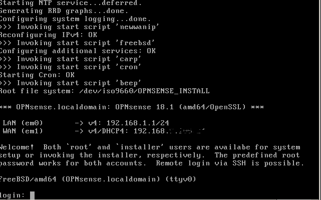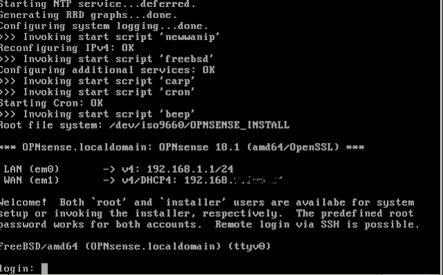 이제 iso 이미지로 부팅하고 로그인 이름으로 root를 입력하고 암호로 opnsense를 입력하여 콘솔에 로그인하십시오.