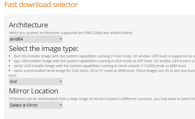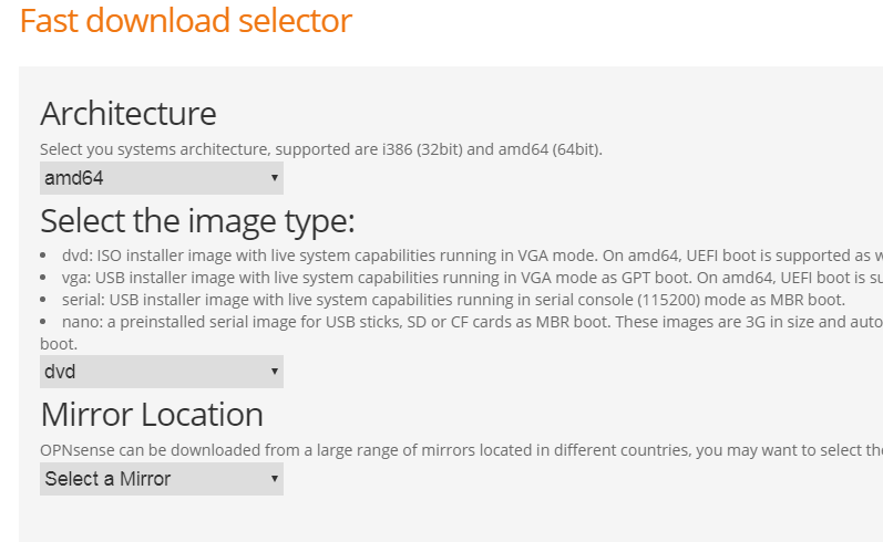 설치하려면 opnsense 에 걸쳐 머리를 https://opnsense.org/download/ , 컴퓨터 아키텍처에 적합한 아키텍처를 선택하여 ISO 파일을 다운로드합니다. 또한 dvd를 선택하여 iso 파일로 만들고 다운로드 미러를 선택하십시오.